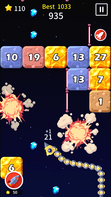 - 좌/우 스와이프로 우주선을 조종하세요! 벽돌에 닿으면 우주선이 벽돌을 부숩니다!