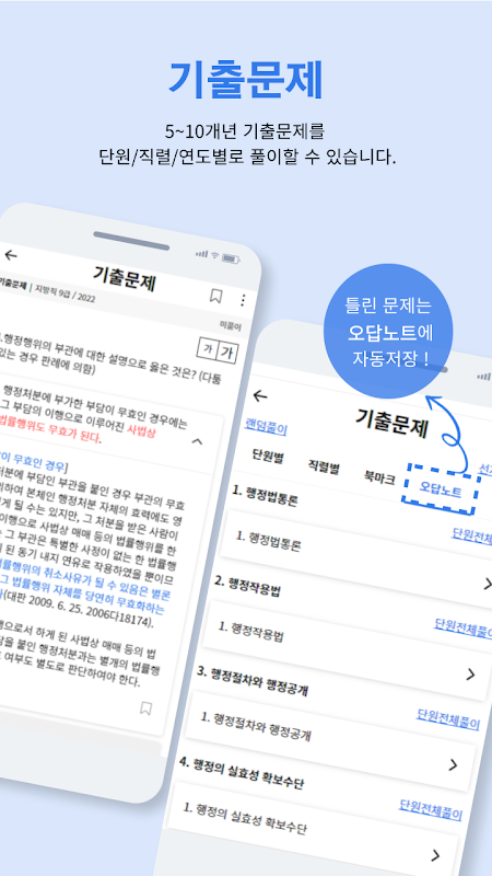 기출문제: 과거 5~10년간의 기출문제를 과목, 직렬, 연도별로 풀이.