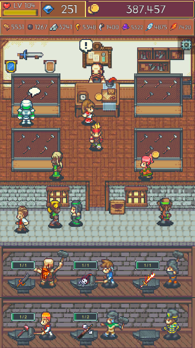 무기를 제작하고 강화해서 모험가에게 무기를 장착 시킬 수 있습니다
