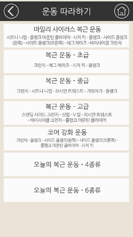 - 운동 리스트 - 운동에 대한 자세한 설명과 주의사항을 운동 영상과 함께 제공합니다. 그리고 하고 싶은 운동을 선택하여 운동할수도 있습니다.