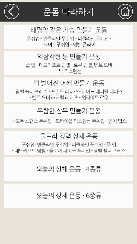 - 운동 리스트 - 운동에 대한 자세한 설명과 주의사항을 운동 영상과 함께 제공합니다. 그리고 하고 싶은 운동을 선택하여 운동할수도 있습니다.