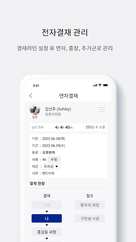 2. 근로자가 연차신청을 앱에서 전자결재로 신청, 결재완료 후 연차 차감