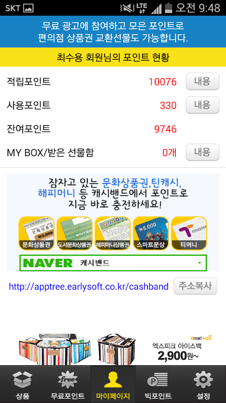 무료포인트를 충전해서 문화상품권과 교환하고 편의점에서 삼각김밥,라면,과자 등등을