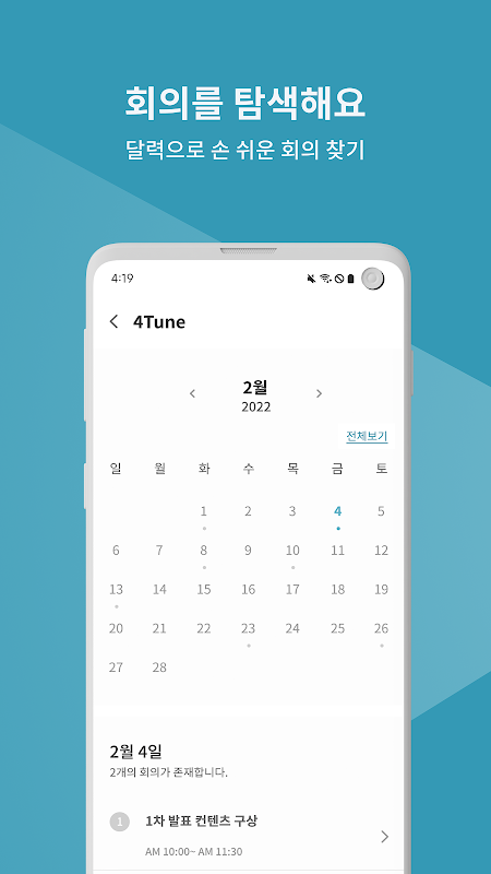 주어진 회의를 한눈에. 캘린더와 회의카드로 회의 일정을 확인하고 준비해보아요.