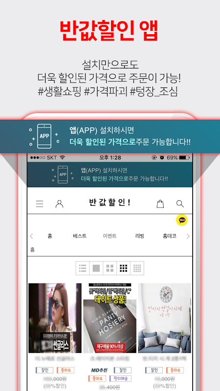 매일매일 신상품 반값할인 !! 할인에 할인을 더한 할인마켓 !! 기본 적립금에 + 어플구매 추가할인까지 !!