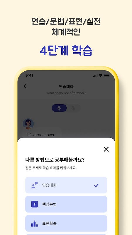 • 각 컨텐츠 마다 언어 교육 전문가가 선별한 주요 표현을 연습할 수 있어요. 다양한 표현을 활용하여 유사한 응용 문장들을 말해 봄으로써 표현을 완벽하게 습득할 수 있어요.