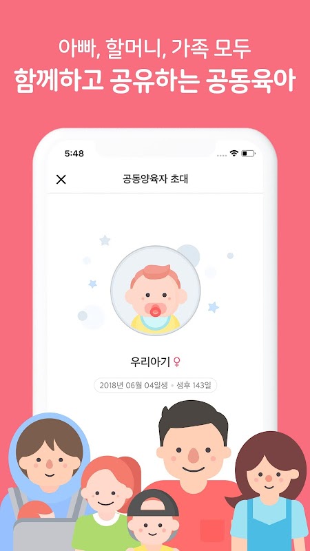 - 공동양육자 초대 : 엄마, 아빠, 할머니, 베이비시터 등 누구나 쉽게 기록하고 함께 공유할 수 있습니다.