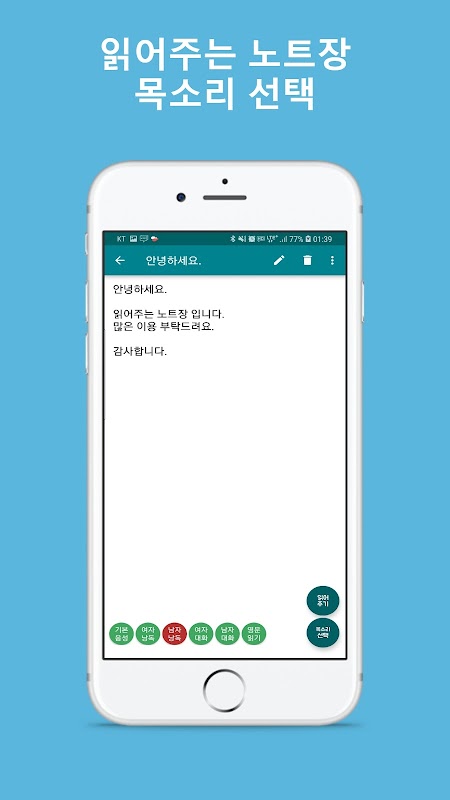작성하거나 불러오기한 노트(메모)를 다양한 목소리로 읽어드려요.