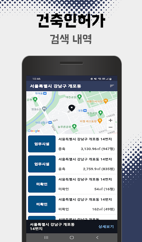 이제 여러분의 스마트폰에서, 단지 클릭 몇 번만으로 쉽고 편하게 건축인허가 현황을 열람해보세요. 지금 바로 부동산 건축인허가 앱을 다운로드하시면 됩니다!