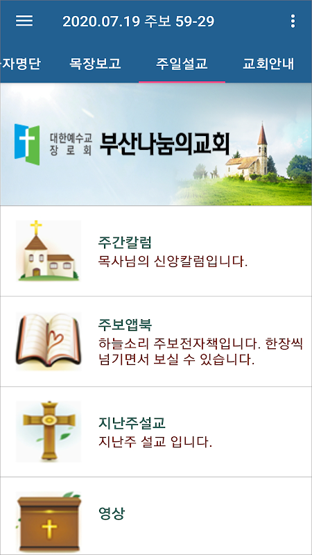 부산나눔의교회 성도들이 종이주보 대신에 스마트폰에서 매주 주보를 볼 수 있는 100% 네이티브앱(어플) 스마트주보입니다.