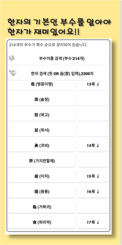 총 214가지의 부수로 한자를 찾고 한자를 공부할 수 있습니다.