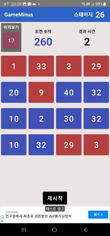 도전 숫자가 100이라면 10, 20, 5 등의 숫자를 연속으로 눌러서 도전 숫자를 0으로 만드는 단순한 게임입니다.
