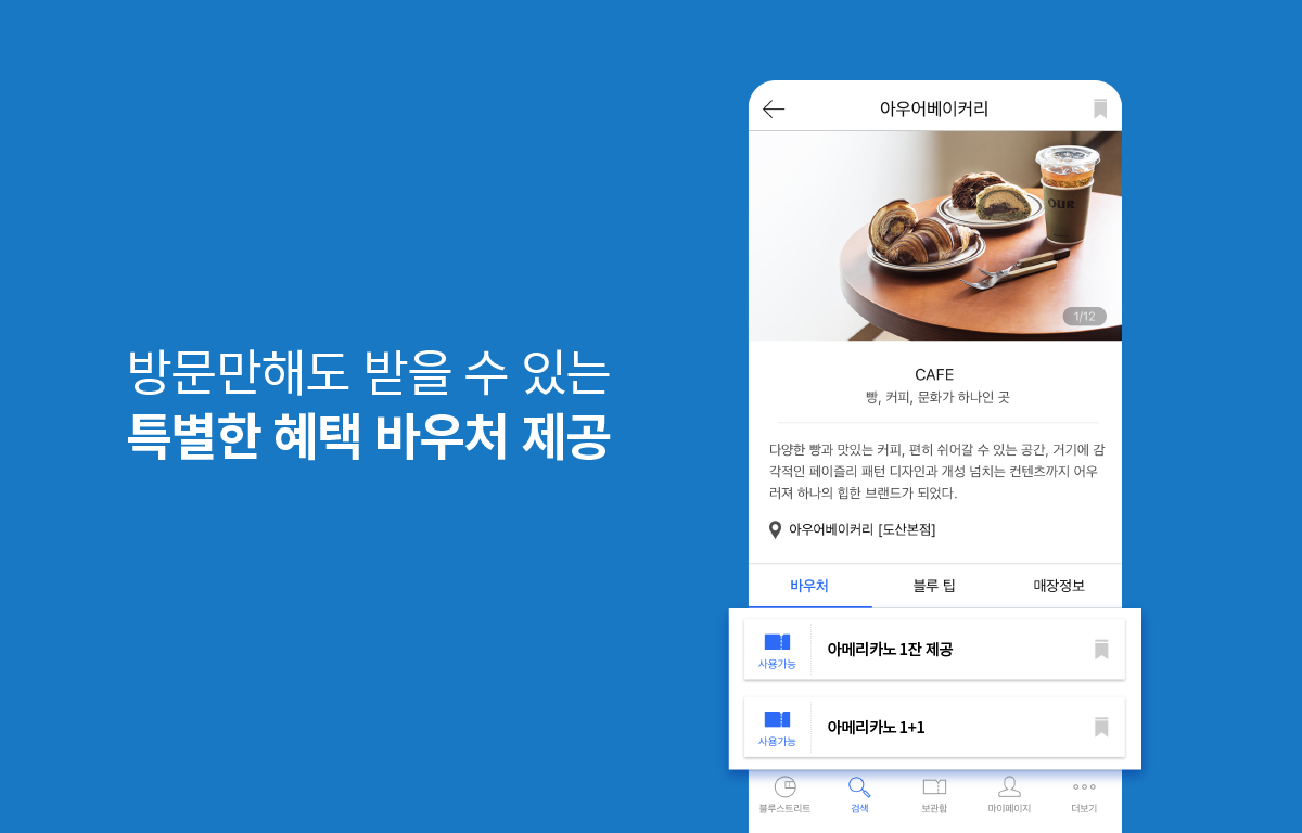 : 앱에 수록된 모든 매장에 방문만 해도 메뉴를 제공하는 바우처와 1+1, 할인 등 2,600여 개의 다양한 혜택을 오직 블루스트리트 회원에게만 제공합니다
