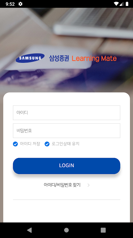 PC환경의 삼성증권 S러닝메이트(http://slm.hunet.co.kr)의 아이디와 비밀번호로 로그인 가능하며, 주요 서비스를 본 모바일 앱에서도 사용하실 수 있습니다.
