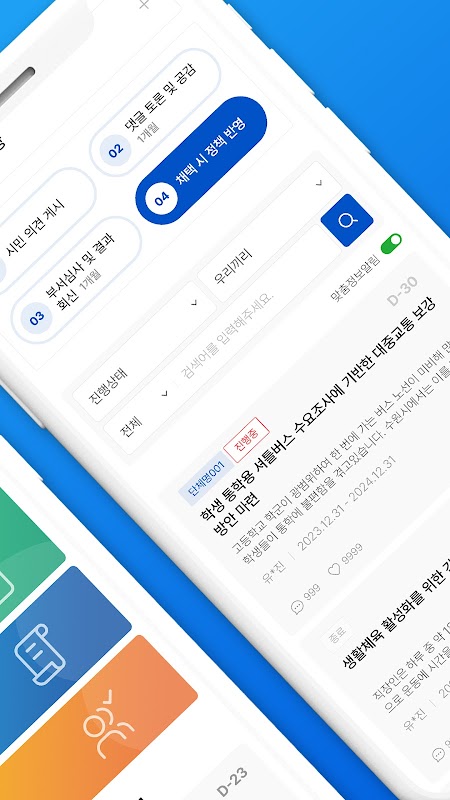 새빛톡톡 모바일 시민참여플랫폼은 시민이 수원시에 정책을 제안하고 시민의 의견을 정책에 반영하며 수원시는 설문, 투표, 신청을 통해 시민의 의견을 묻는 양방향 소통창구 및 돌봄이 필요한 시민이 신청창구로 다음과 같은 서비스를 제공하고 있습니다.