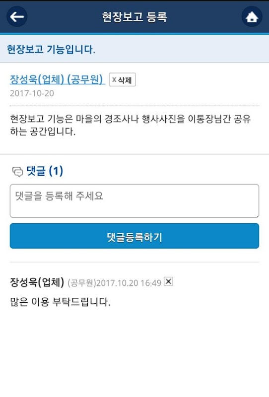 - 마을에 행사 및 소식등을 사진촬영 또는 기존의 이미지를 모바일에서 직접 전송하여 이통장님간 정보를 공유할 수 있습니다.