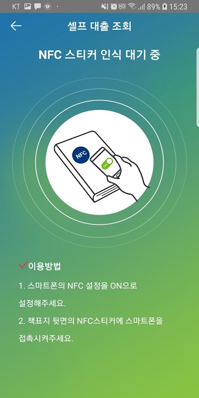 4) 스마트 폰의 NFC 기능을 이용하여 모바일 셀프 도서대출을 할 수 있습니다.