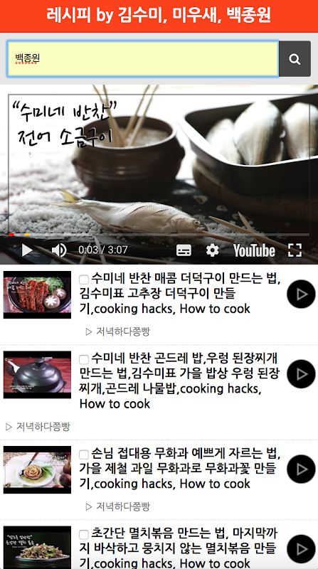 수미네 반찬 - 집밥 백선생 - 미우새 - 요리 레시피TV요리 레시피 한번에 모아 편하게 검색하고 영상으로 쉽고 맛있게 만드세요!