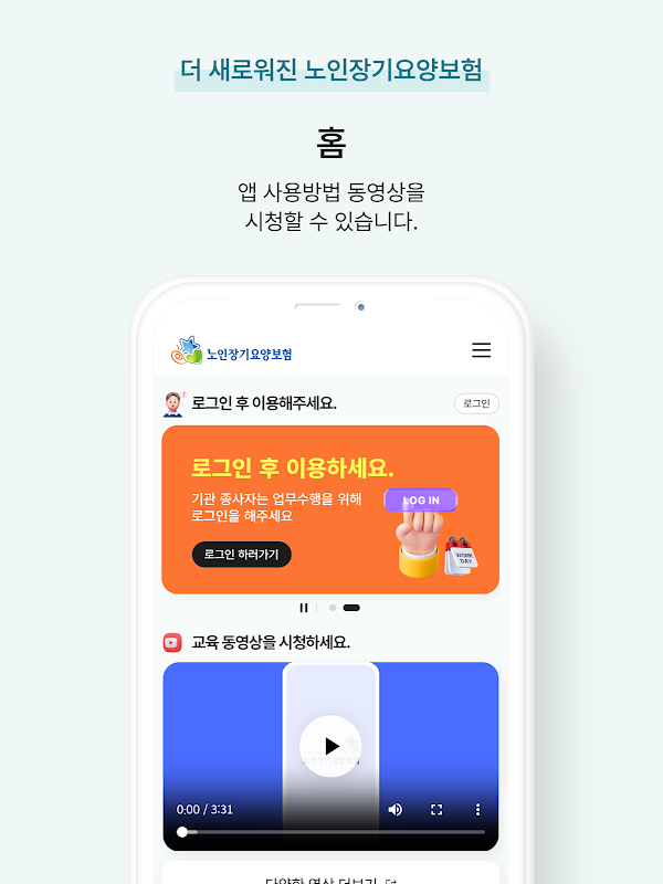 본 앱은 시범운영용 앱으로 일부 장기요양기관 종사자와 수급자(보호자)만 사용 할 수 있으며 그 외 사용자는 정식 배포 이후 사용 가능합니다.