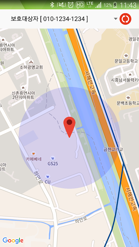 : 응급호출시 사용자의 실시간 위치 정보가 보호자에게 전송