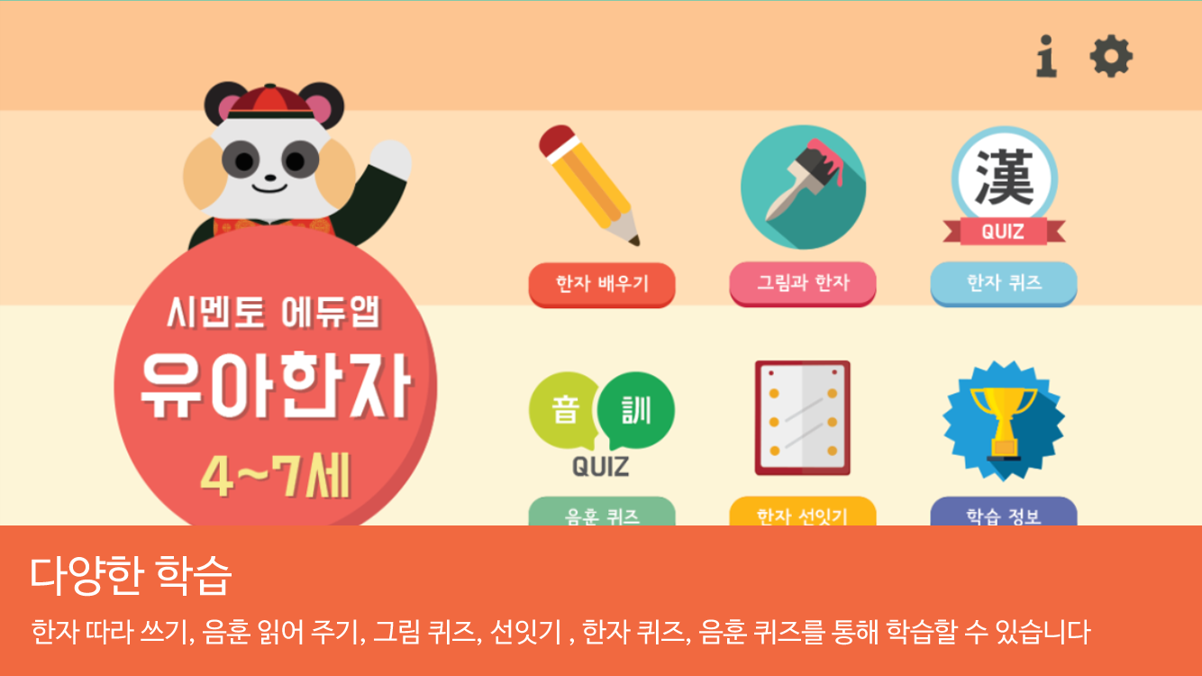 기초적인 한자들부터 난이도가 높은 한자까지 다양하게 학습할 수 있습니다. 한자 배우기, 그림과 한자, 한자 퀴즈, 음훈 퀴즈, 한자 선잇기 총 5가지의 학습이 가능합니다.