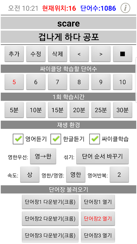 싸이클 영어단어장은 자동으로 영단어와 뜻을 최소 5회이상 싸이클 반복하며 읽어주어 쉽게 영어단어 공부를 할 수 있도록 도와줍니다.