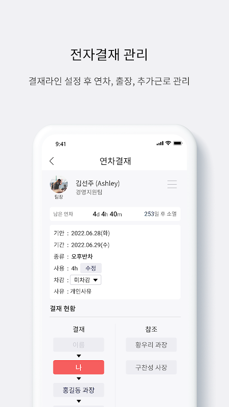 2. 근로자가 연차신청을 앱에서 전자결재로 신청, 결재완료 후 연차 차감
