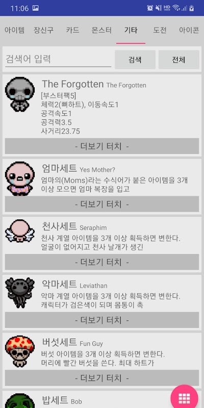 아이작 리버스,애프터버스,애프터버스+ 아이템, 몬스터, 기타정보를 검색할 수 있습니다.