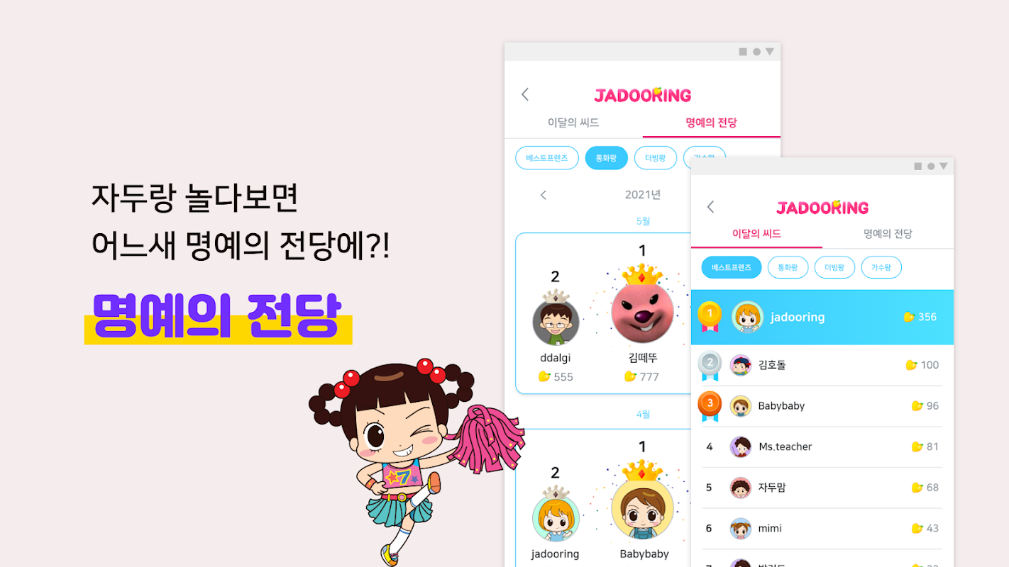 안녕자두링 앱을 켜면 바로 RRR... 자두에게 영상전화가 와요! 매일 자두와 그 날의 주제에 관한 대화도 나누고 일상 애니메이션을 보며 생각도 나눠보세요. 다른 친구들과 서로 모은 뱃지를 비교하며 대결해 볼 수도 있겠죠? 유학가지 않고 내 방에서 연습하는 일상 영어회화!