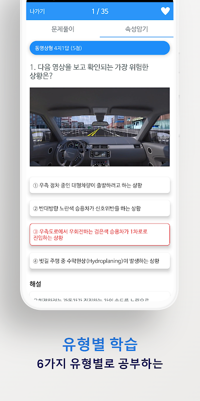 도로교통공단에서 제공되는 100% 동일한 문제를 안전운전필기시험 앱으로 보다 쉽게 공부 하실 수 있습니다.