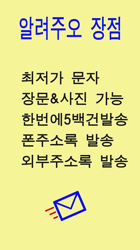 누구나 쉽게 한번에 많은 량의 문자를 보낼 수 있는 단체문자앱! 이용료 또한 아주 저렴하게 이용가능. 폰에 저장된 주소록 및 외부에 주소록 가능