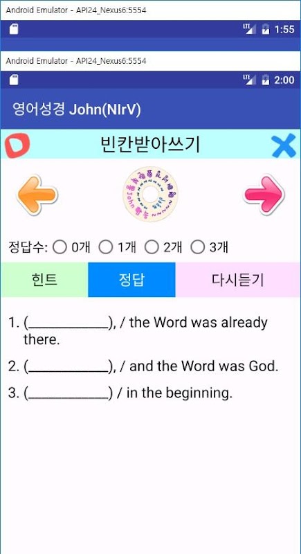 한편 NIV Bible이 ‘성인용’이라면 NIrV(New International Reader's Version) Bible은 ‘어린이용’에 해당합니다. NIrV Bible은 NIV Bible과 내용면에서는 같지만 어휘 수준과 문장길이 등이 어린이 눈높이에 맞춘 쉬운 영어로 기술되어 있습니다. 그러므로 우리와 같은 초급 영어학습자들 NIrV Bible로 암송하는 것이 매우 적절합니다. 본 애플리케이션은 초급자용으로는 NIrV Bible을 이용하고, 중급이상의 영어 학습자들을 위해서는 NIV Bible을 이용할 계획입니다. 또한 자연스러운 우리말 문장을 위해서는 '현대인의 성경(KLB)'과 개역한글(KRV)'을 인용하였습니다.