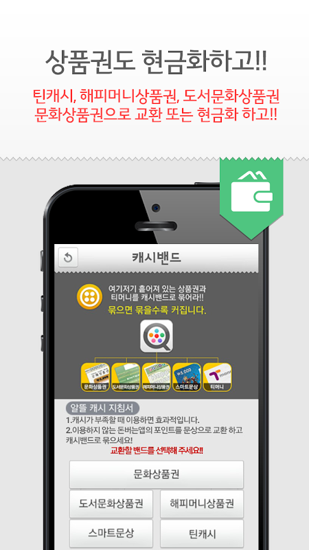 1. 해피머니, 문상, 틴캐시, 도서문화상품권으로 스타벅스기프티콘으로 변경가능한 캐시밴드 기능