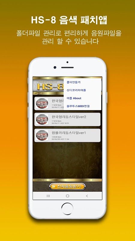 야마하 일렉톤 HS-8 전체음원(스타일&음색)을 스마트폰에 악기음원을 저장하고 다시 악기로 보내는 일렉톤전용 음원 저장어플입니다.