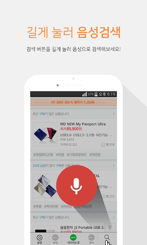 돋보기 아이콘 클릭 후 상품명 타이핑 후 '최저가 버튼' 클릭 하면 네이버, 다음, 다나와, 쿠차, 에누리에서 가장 저렴한 가격이 있는 사이트를 알려줍니다. 검색한 내용을 다른 사이트에 다시 검색하지 마세요. 엄지쇼핑에서 옆으로 돌리기만 하세요.