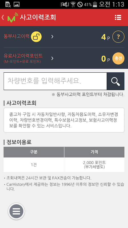 서비스 이용방법 : 엠카맨에 회원가입을 하시고 사고이력조회 잔액을 충전하시면 이용이 가능합니다.