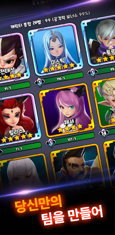 오늘도 디펜스에서 영웅을 합치고, 성장시키고, 적들을 막아보세요!