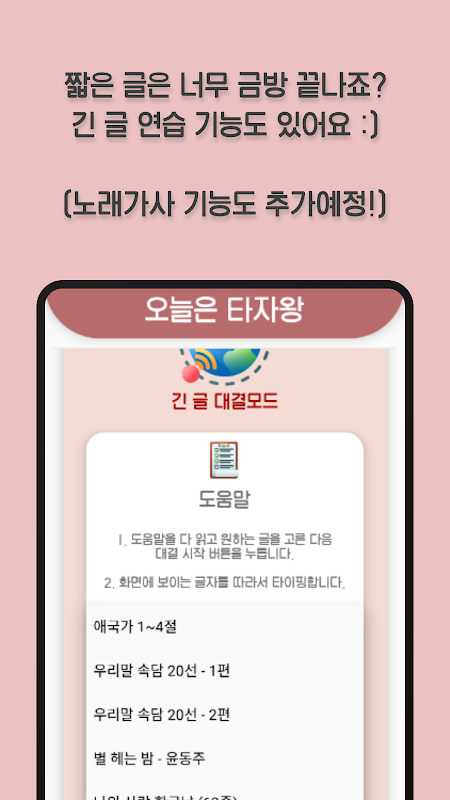 짧은 글 / 긴 글 중 선택하여 타자연습을 하실 수 있어서 질리지 않게 플레이 할 수 있습니다.