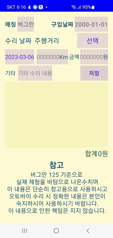 오토바이 수리후 금액 이나 내용을 저장해 두었다가 나중에 찾아볼수 있는 오토바이 가계부 같은 앱 입니다.
