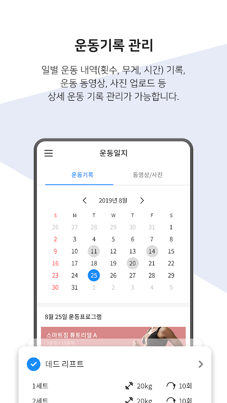 - 운동 동영상, 사진 업로드로 더 완벽한 운동 기록이 가능합니다.
