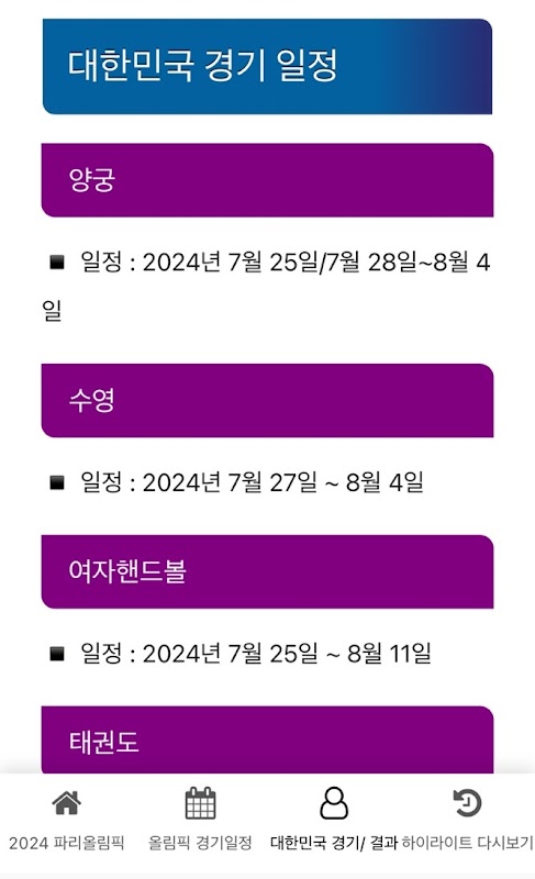 이 앱은 2024년 7월 26일부터 8월 11일까지 프랑스 파리에서 열리는 2024 파리 올림픽의 일정과 결과를 알아볼 수 있는 앱입니다.