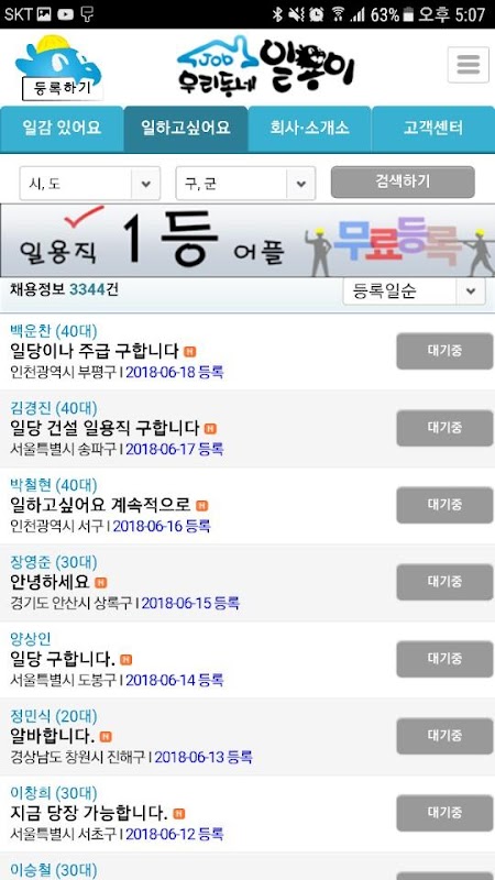 우리동네일용이 - 일용직, 인력, 용력, 일당 정보