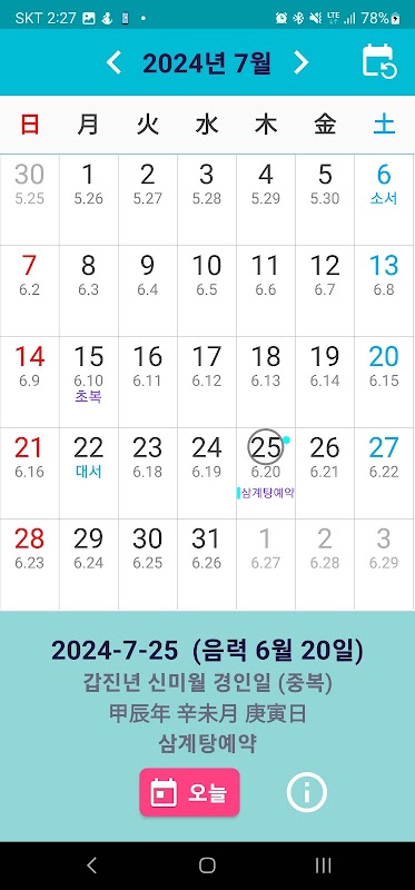 음력 달력은 양력 달력 뿐만 아니라 음력 달력, 24절기, 복날, 임시 공휴일, 대체 휴일 등을 확인 할 수 있는 달력 앱입니다.