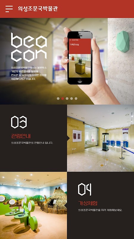 비콘(Beacon : 블루투스 4.0(BLE) 프로토콜 기반의 근거리 무선통신 장치)이 블루투스를 활성화한 스마트폰에 근접시 해당 비콘의 정보를 스마트폰으로 의성조문국박물관 전시장을 안내받을 수 있는 어플리케이션입니다.