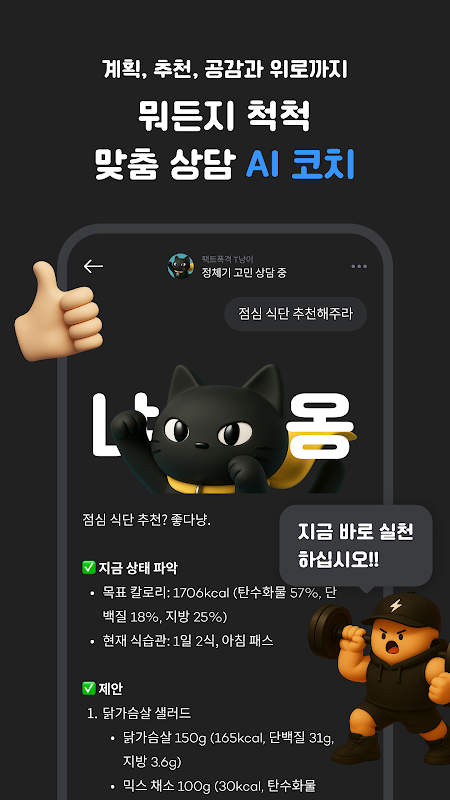 - 식단 추천, 운동 루틴 만들기 등 다이어트와 관련된 주제라면 뭐든지 가능! 나만의 맞춤 코치 ‘말랑 AI’가 내 신체 정보와 목표를 기억해서 조언, 상담, 맞춤 플랜을 제공해 드려요