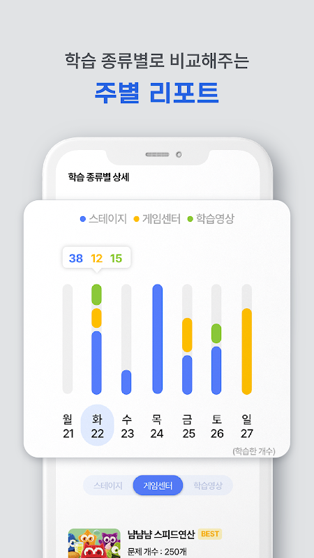- 월간 보고서에서는 자녀가 어떤 부분에서 취약한지 알려줌으로써 학습에 있어 부족한 부분을 보완할 수 있습니다.