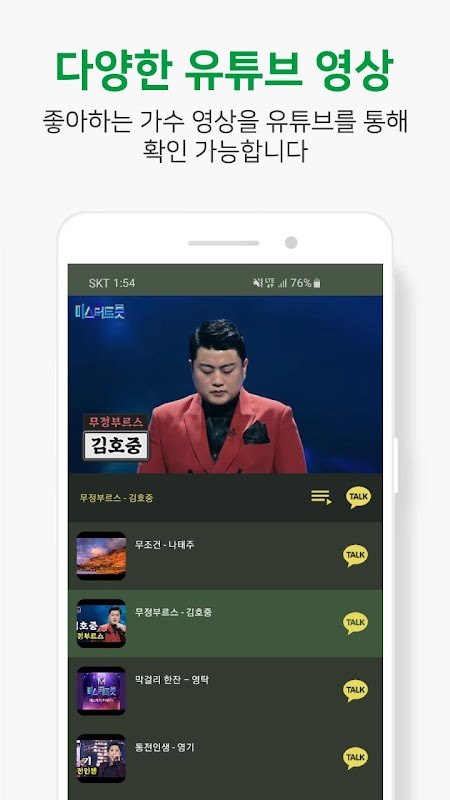 - 영상보기 – 해당 가수 혹은 카테고리의 유튜브 영상을 확인하실 수 있습니다. 다양한 공연 혹은 트로트를 언제든지 영상으로 확인하실 수 있습니다. 유튜브 목록이 형성이 되어 원하시는 유튜브 영상을 클릭만으로 변경하여 보실 수 있습니다.