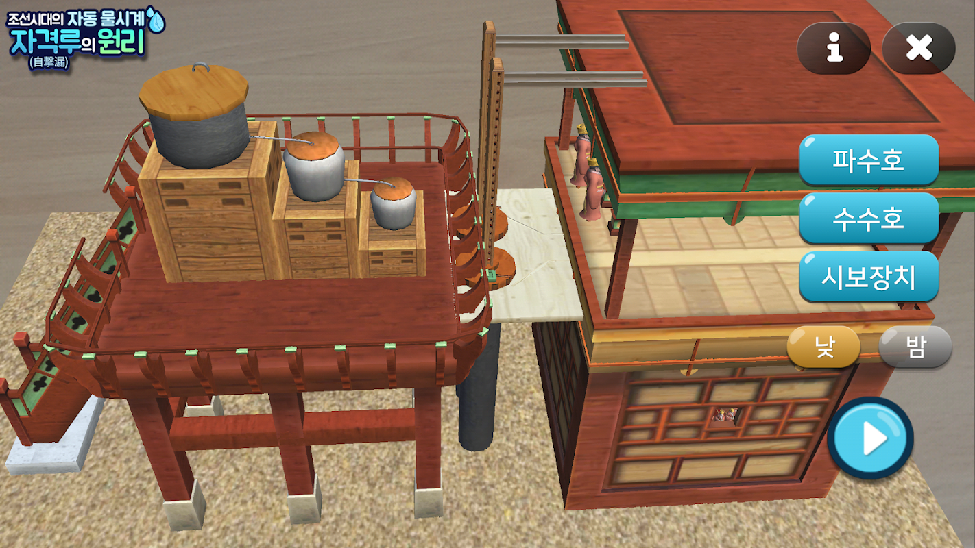 '자격루의 원리' 조선 시대 최고의 과학자로 기억되는 장영실이 만든 물시계, 자격루의 원리를 알아보는 관찰 AR 콘텐츠 입니다.