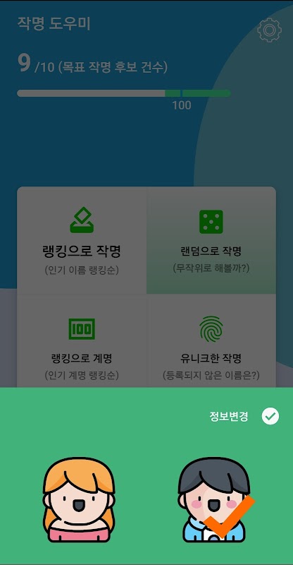 완전 무료 작명어플이에요. 인기 랭킹 이름을 이용하여 이쁜 이름을 작명해 보세요. 또는 나만의 유일한 이름을 만들어 보세요.