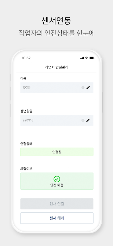 작업자 안전관리 모바일로 센서와 연동하여 사용자의 안전상태를 확인 할 수 있습니다.